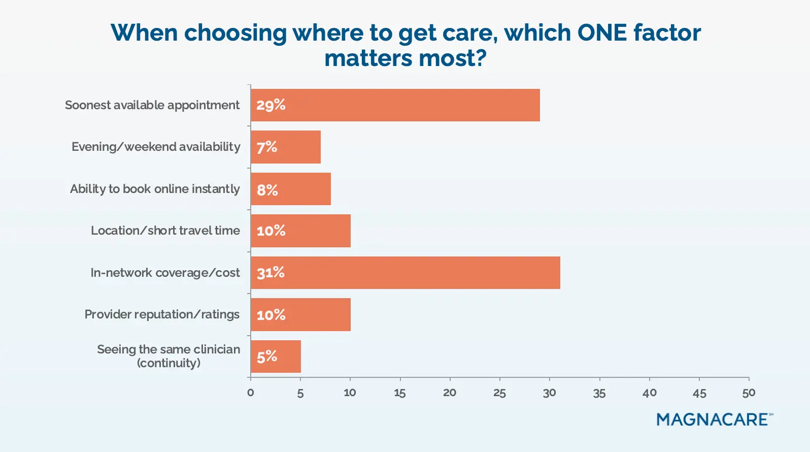- Cost vs. Access: 31% pick in‑network cost and coverage as the top decision factor, while 29% choose whichever provider has the soonest available appointment.