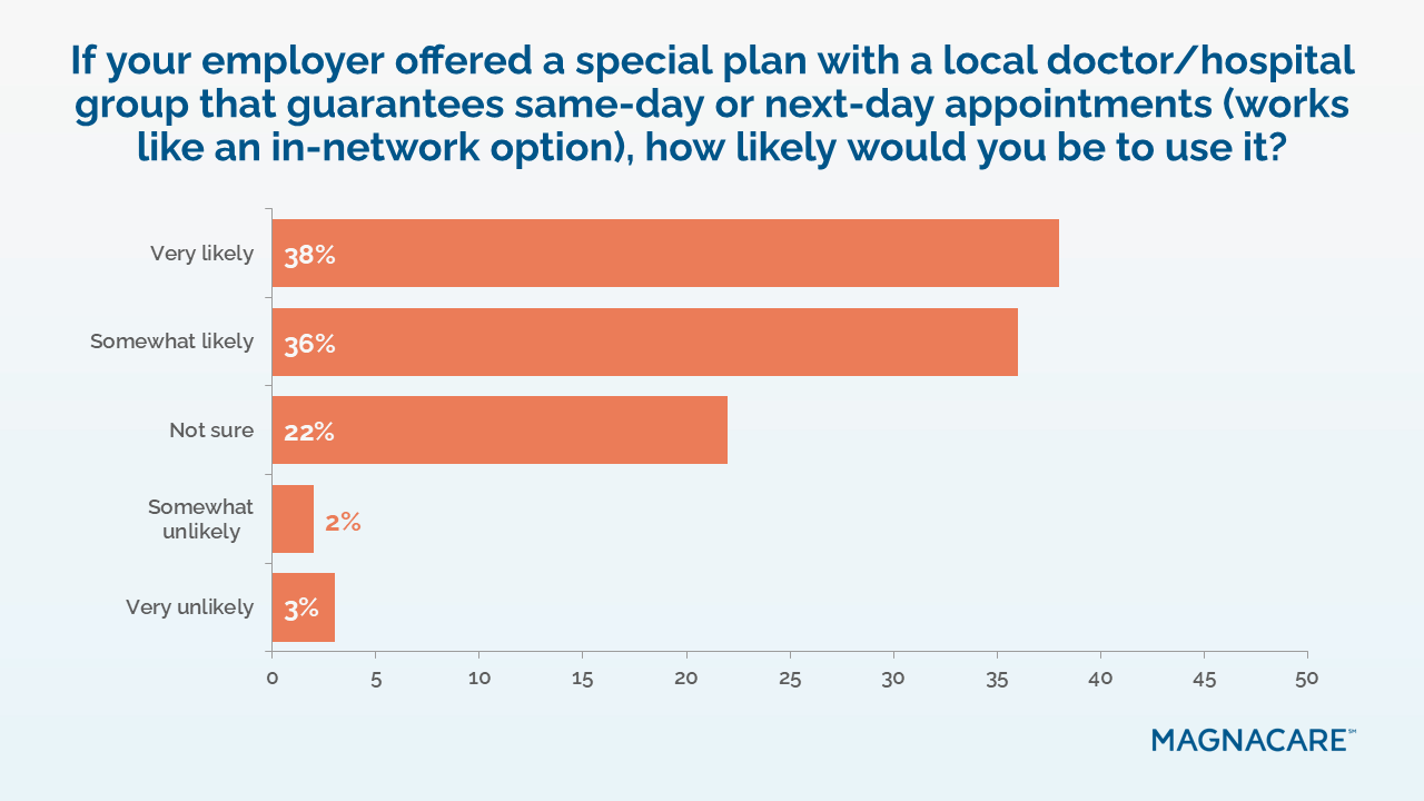 Members are open to employer-facilitated options when the value is obvious. A strong majority (74%) say they’re likely to use an employer-offered local option that functions like in-network. The nudges that move behavior are clear: guaranteed same- or next-day appointments (27%) and lower out-of-pocket costs (26%). Yet awareness is uneven. Thirty-eight percent aren’t familiar with these offerings, which means latent demand is leaving value on the table.