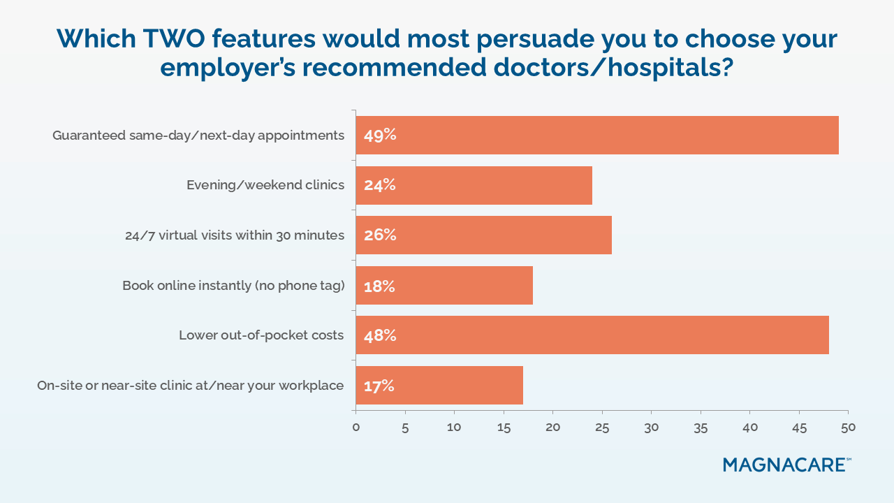 - Persuasion Factors Differ: Guaranteed same- or next‑day appointments would persuade 27% to choose employer‑recommended providers, while 26% say lower out-of-pocket costs would do the same.