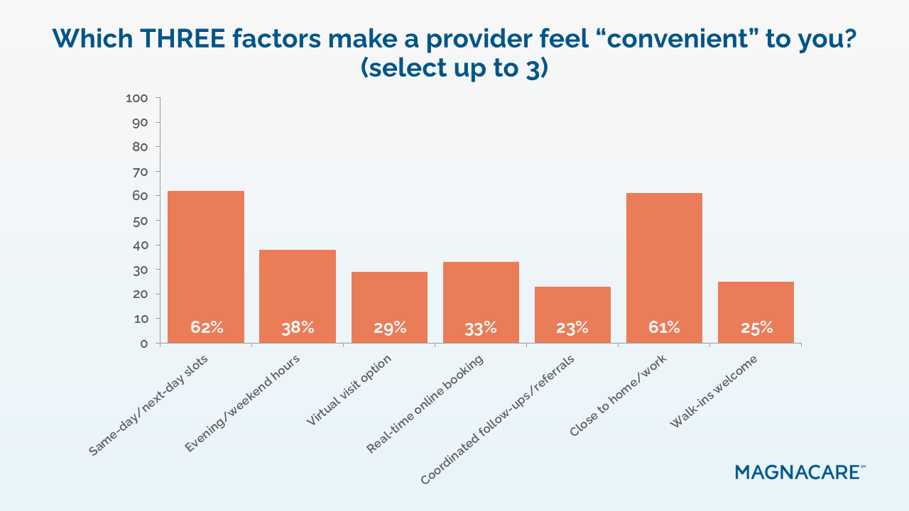 Patients are telling us that convenience is mostly about time. In their mental model, “good access” means seeing someone quickly without jumping through hoops. That’s why “soonest available appointment” is nearly equal to “in-network cost/coverage” as the top decision driver — 29% versus 31% — and why so many define convenience through “same-/next-day options” (62%). It’s a recalibration of expectations shaped by the rest of consumers’ lives: certainty now, not callbacks later.