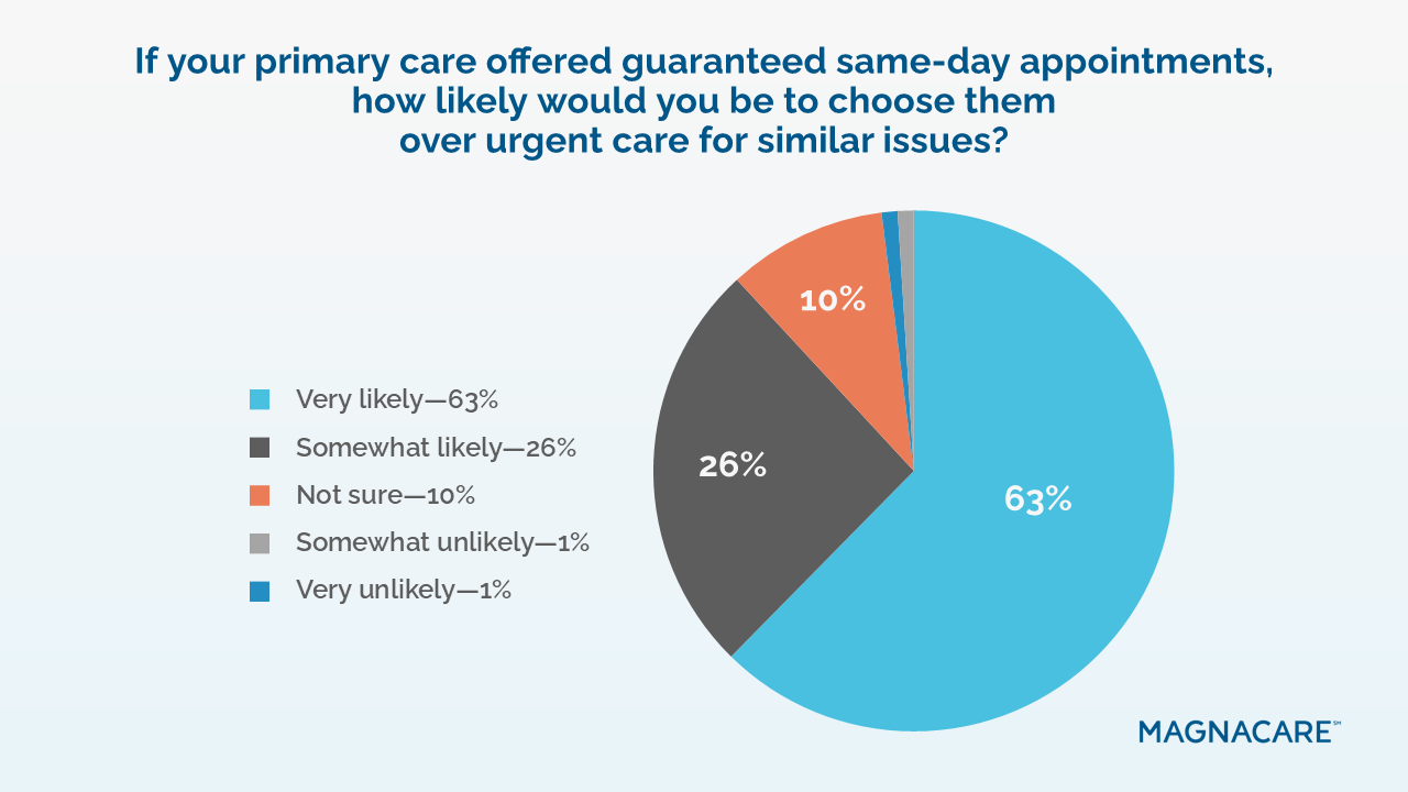 Urgent care thrives because it reliably reduces delays in care. But the data shows this advantage is conditional. If primary care could match that speed, patients would prefer continuity with their personal clinician. In fact, nearly all surveyed (89%) would choose their PCP over urgent care given a same-day guarantee. Today, however, less than half (43%) say they usually get same-day when they want it, and less than a quarter (24%) say they never do. That gap, more than preference, explains the uptick in urgent care usage.
