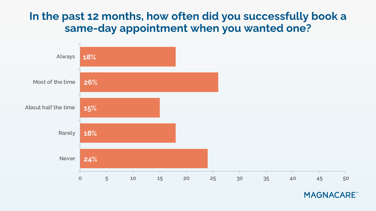 - Same-Day Access Gaps: Only 43% say they “always” or “most of the time” get a same-day appointment when they want one, while nearly a quarter (24%) say they never do.