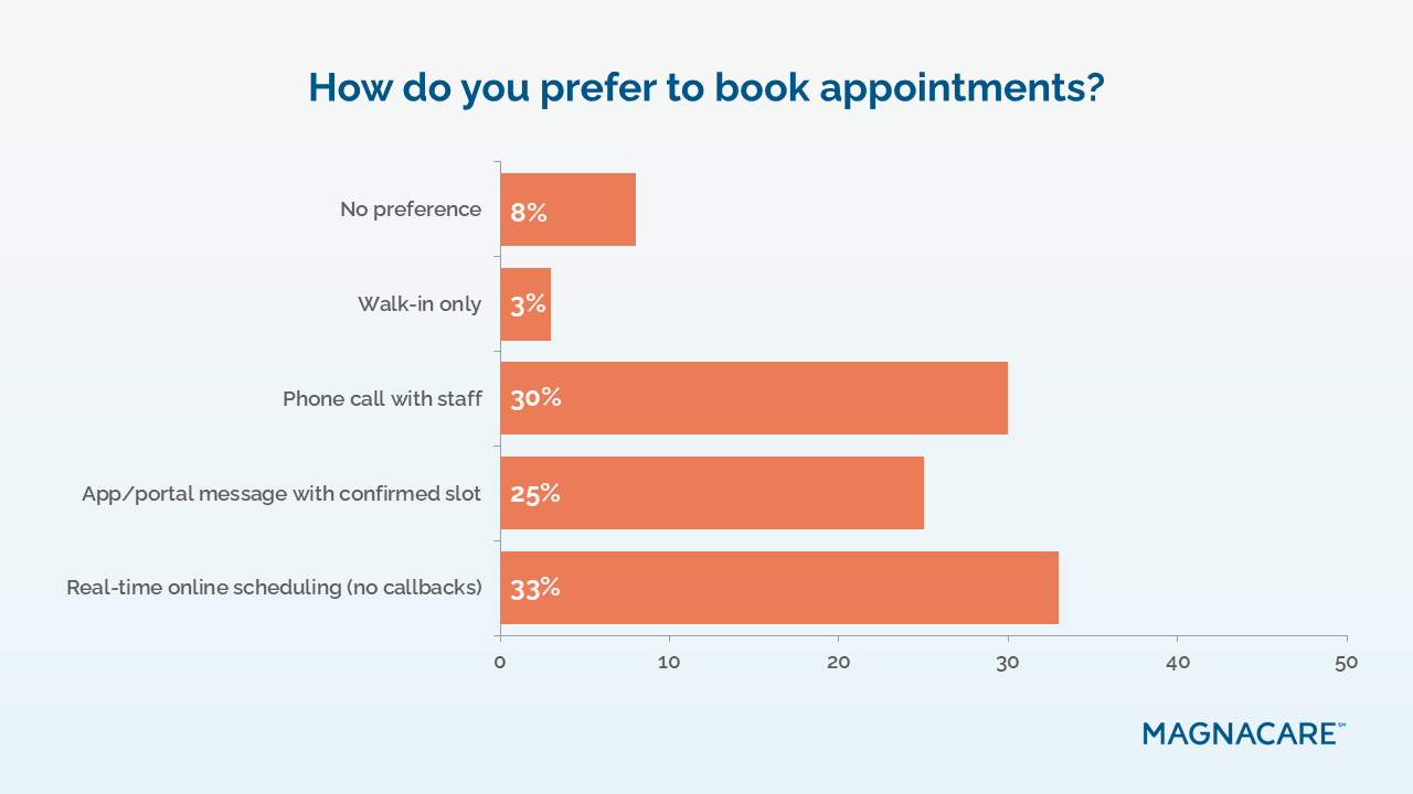 - Online Booking Matters: Six in 10 patients (60%) say the ability to book online instantly is extremely or very important when choosing a provider.