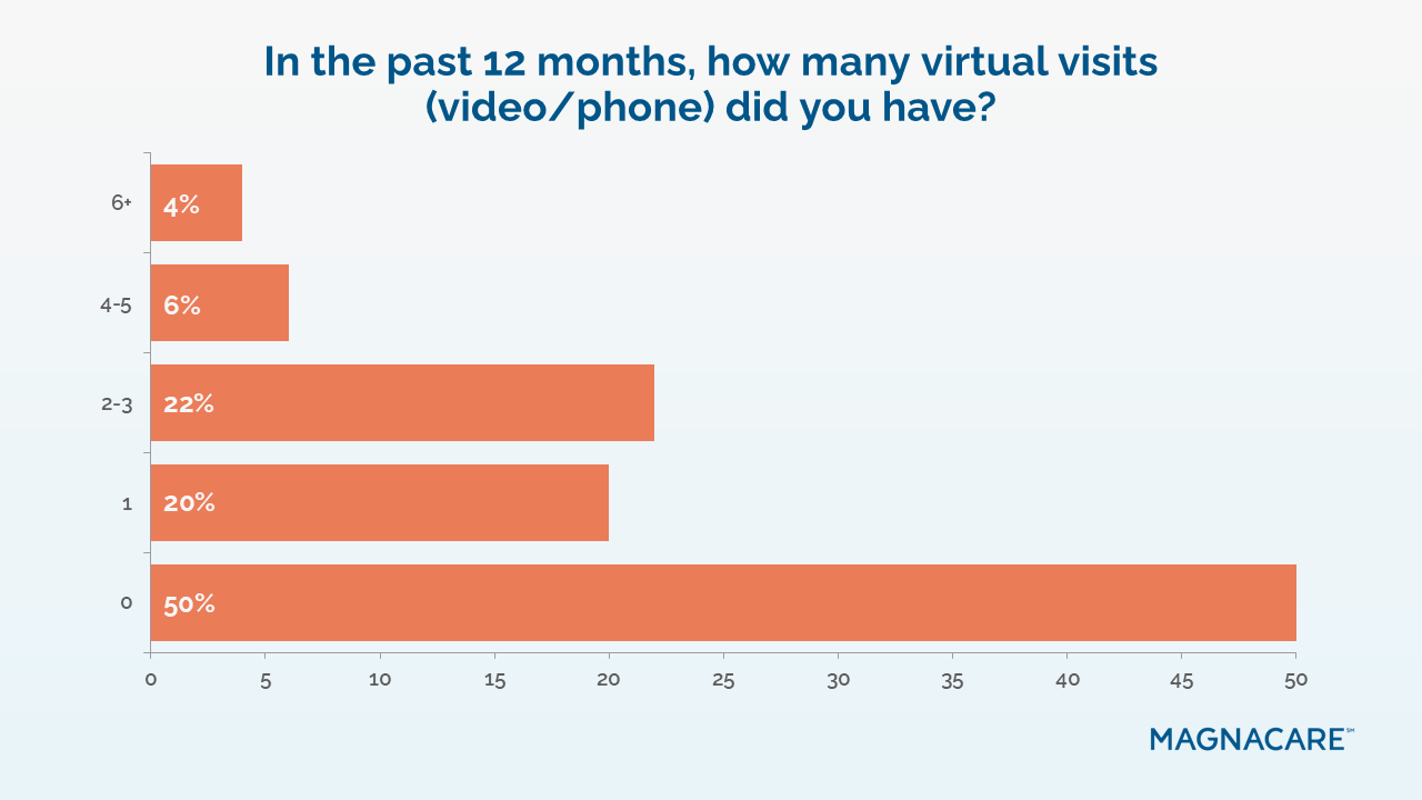 - Virtual Care Unused: Half of patients (50%) report having no virtual visits over the past year, even though time savings (36%) and faster access (27%) are their top reasons for considering virtual care.