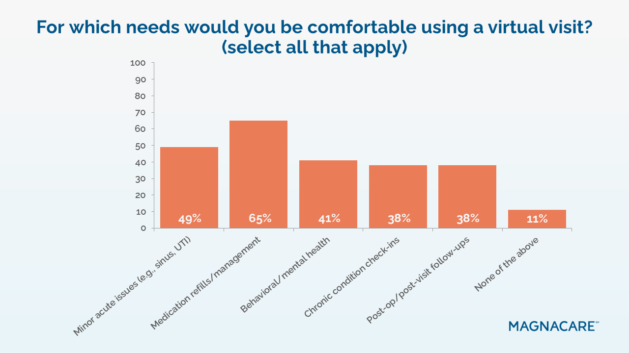 Virtual visits remain underutilized for general care. Half of respondents report zero virtual visits in the last year (50%), even though they’re most comfortable using that method for clear, routine tasks, like medication refills or management. When people do choose virtual, their reasons are strikingly practical: no travel needed and time savings (36%) and faster consultations (27%). This signals that the demand exists, but patients need an obvious, credible pathway to use virtual care.